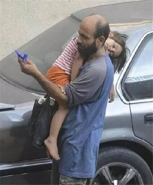 黎巴嫩贝鲁特街头,一个抱着孩子的父亲在卖圆珠笔。看到这位父亲的表情了么?希望战争远离这个星球…
