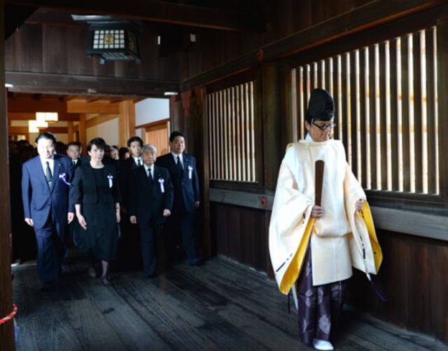 ▲2014年8月15日,一群日本国会议员在靖国神社本殿参拜。图自新华网