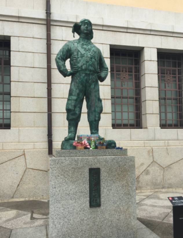 以上这些当然不是游就馆的全部,在展览馆外的院落里,坐落着几处塑像,其中之一是神风“特攻勇士”之像。“神风特攻队”是二战末期日本挽救其战败局面在穷途末路之下整出的“战争怪胎”,按照要求,特攻队员在其战斗机上装上大量烈性炸药,一旦发现美军舰艇或登陆部队目标,就连人带机撞下去。