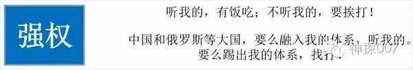 所以说,美国的全球化综合来看就是“强权”统治。顺从美国的国家,可以在为美国输送利益的基础上生存和发展,不顺从美国的国家,则会被美国打击甚至被颠覆政权。即便是中国和俄罗斯这样的大国,美国也要求必须听它的,才能融入它所设计的全球化体系,否则就会被踢出体系并且受到“攻击”。