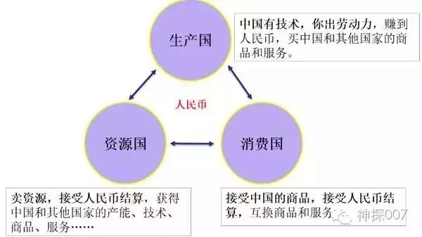 生产国只要愿意接受中国企业的投资、技术输出、品牌输出,或者愿意接受人民币为记账货币的贷款,中国就愿意出钱、出技术、出经验把工厂建到它想建的地方,它出劳动力,生产出商品给本国用或出口给其他国家,若是出口商品愿意接受人民币结算,则获得人民币后可以换取中国或愿意接受人民币的国家的商品和服务。