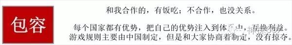 所以说,中国的全球化综合来看就是“包容”共处。愿意和中国合作的,可以求同存异,互换优势和利益,即使不愿意和中国合作,只要不对抗,也没关系,随你自己发展。其实每个国家都有自己的优势,只要愿意把优势注入到中国版的全球化体系中,就能和其他成员国互换利益,每个国家都是相对平等的利益输出者和利益获得者。当然,游戏规则主要由处在中心地位的中国制定,而其他成员国则可以参与协商规则的制定,基本上不存在中国强行制定规则、强行掠夺的行为。
