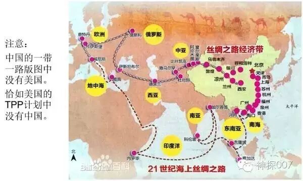 心细的朋友会发现中国的一带一路包含了亚洲、欧洲和非洲,但没有包含美洲,自然就没有包含美国,其实我们想把美国包含进去美国也不会理睬,因为目前的美国只会玩自己定义的游戏,不情愿参与中国设计的游戏。正如美国想用TPP取代WTO,TPP也明显不想让中国加入,当然在现有的TPP规则下中国也不情愿加入。