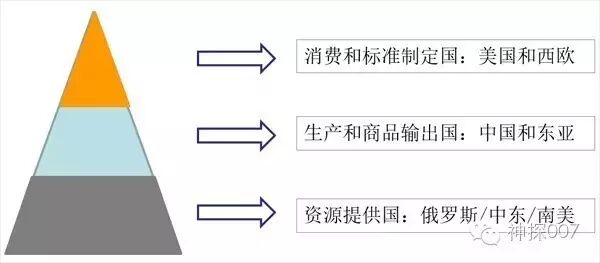 美国把世界经济体系分为三个层级:资源提供国、生产和商品输出国、消费和标准制定国(主要是美国)。这三个层级是金字塔结构,即资源提供国处在被压迫的最底层,生产和商品输出国处在中间层,而消费和标准制定国则处于具有统治地位的顶层。经济利益从底层往上输送,军事、政治和文化控制则从顶层向下输出。