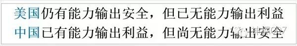 那就是——美国仍有能力输出安全,但已无能力输出利益。而中国已有能力输出利益,但尚无能力输出安全。