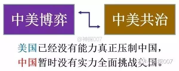 因为美国已经没有能力真正地强有力地压制中国,中国的崛起是必然,但中国暂时也没有实力全面挑战依然是世界第一强国的美国,所以中美两国只能在博弈中被动或主动妥协。可能有时你会多占点便宜,有时我会多占点便宜,而只要中美两国内部不犯致命错误,一方彻底击垮另一方在短期内是不可能出现的。当然,总体上美国会进一步衰弱,中国则会进一步强盛。中美共治将是未来较长一段时期内,中美互相博弈和妥协的结果,是整个世界无奈而又现实的选择。