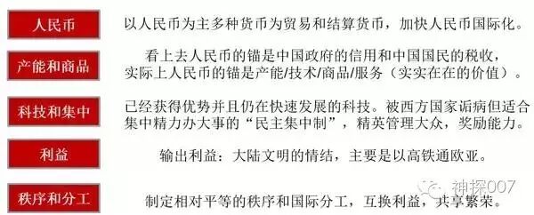 第四,中国能够为世界输出利益,并且是全球利益输出能力最强的国家。几千年来,中国一直是大陆文明的佼佼者、泱泱大国,也曾是世界文明之颠、经济之巅、军事之巅,大陆情结是华夏基因的组成部分,陆地的大一统和对外辐射是中国与生俱来的“需求”,对大陆被封锁这样的事情,中国会有无比强烈的抗性,只有在国弱之时中国才被迫收缩,国强之时都会重新建立陆地大一统和海陆两方面的对外辐射。中国会用高铁为主、航空和航运为辅连接欧亚非大陆,实现中国版全球化的贸易流和利益互换纽带。