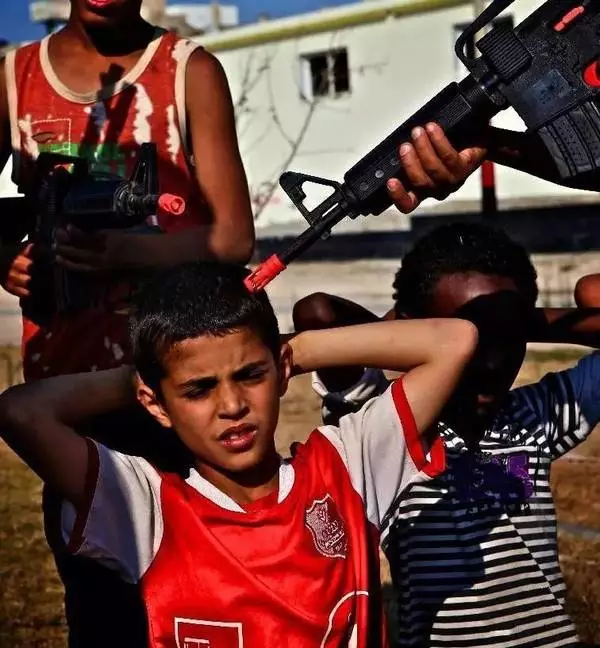 ▲ 图中的一群利比亚小孩并不是被当做俘虏抓了起来,而是正在玩游戏,他们玩的游戏跟我们童年玩的也许不太一样:几把真枪当玩具,假装被抓住然后跪地抱头,这样的动作也许并不是游戏中才知道的,可能是现实生活所迫,他们经常会被侵略者这样用枪指着脑袋……
