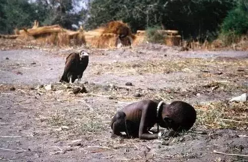 ▲ 一个瘦得皮包骨头的苏丹小女孩在前往食物救济中心的路上再也走不动了,趴倒在地上。而就在不远处,蹲着一只硕大的秃鹰,正贪婪地盯着地上那个黑乎乎、奄奄 一息的瘦小生命,等待着即将到口的“美餐”。