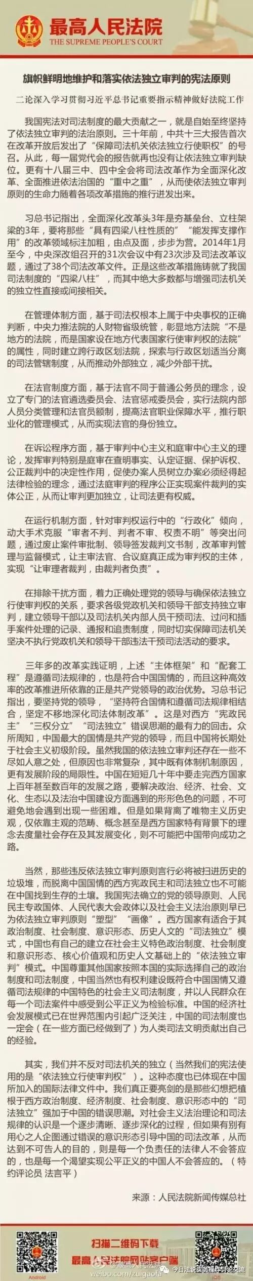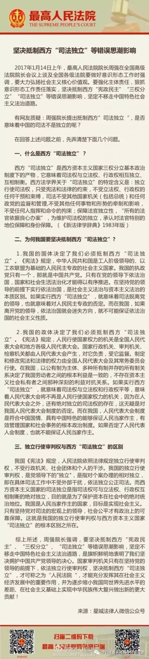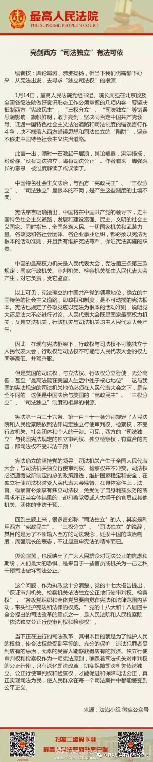 最高人民法院官方微博@最高人民法院1月15日发布题为《亮剑西方“司法独立”有法可依》文章,解释西方的“司法独立”与我国宪法规定的独立审判权、独立检察权,有重合的内容,即司法权不受非法干预。